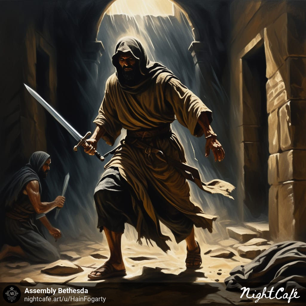 Ehud stepped close and declared, “I have a message from God for you.” As the king rose from his seat in respect, Ehud drew the hidden blade from his left hand and drove it into Eglon’s belly with such force that the hilt disappeared. A brutally graphic detail illustrates the humiliating nature of the tyrant’s death by depicting how fat closed over the weapon and the king’s bowels discharged. In order to escape, Ehud left the sword embedded, slipped out, locked the doors behind him and fled.